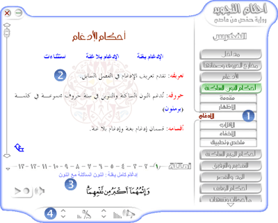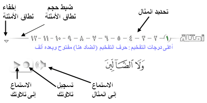يمكنك البرنامج من الاستماع إلى هذه الأمثلة بصوت أحد القراء المعروفين ويتيح لك إمكانية تسجيل تلاوتك ومن ثم الاستماع إليها.